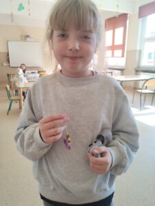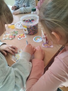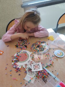 Tworzenie wzorów z koralików wymagało od dzieci cierpliwości, precyzji i kreatywności. Każdy uczestnik mógł samodzielnie zaplanować swój projekt, dobierając kolory i układając koraliki według własnej wyobraźni. Efekty pracy były imponujące – powstały serduszka, gwiazdki, zwierzątka oraz inne fantazyjne kształty.