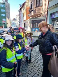 Kulminacyjnym punktem dnia był szkolny rajd. Zadaniem uczniów było zaproszenie mieszkańców naszego miasta do wspólnego odśpiewania hymnu szkoły oraz wymiana muszli jakubowej na coś „wartościowego” – gest, słowo, uśmiech lub drobiazg.