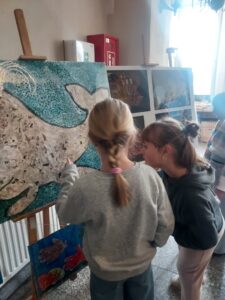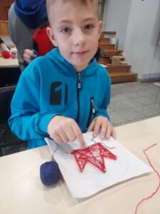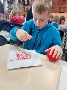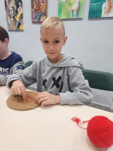 Pani Barbara w ciekawy i profesjonalny sposób wprowadziła dzieci w świat tej niezwykłej techniki artystycznej. Opowiedziała, czym jest string art, a także nawiązała do tematu sztuki – czym ona jest, gdzie możemy ją spotkać i jak każdy z nas może ją tworzyć.