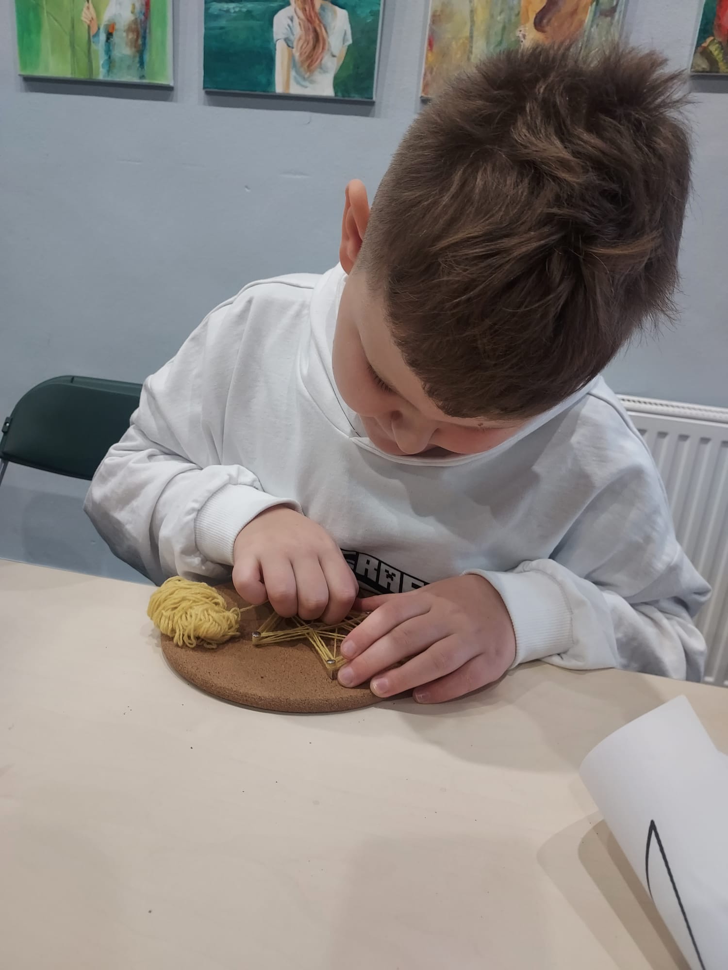 Pani Barbara w ciekawy i profesjonalny sposób wprowadziła dzieci w świat tej niezwykłej techniki artystycznej. Opowiedziała, czym jest string art, a także nawiązała do tematu sztuki – czym ona jest, gdzie możemy ją spotkać i jak każdy z nas może ją tworzyć.