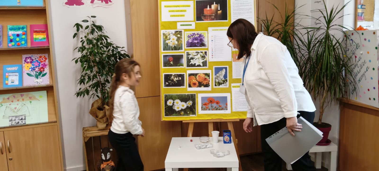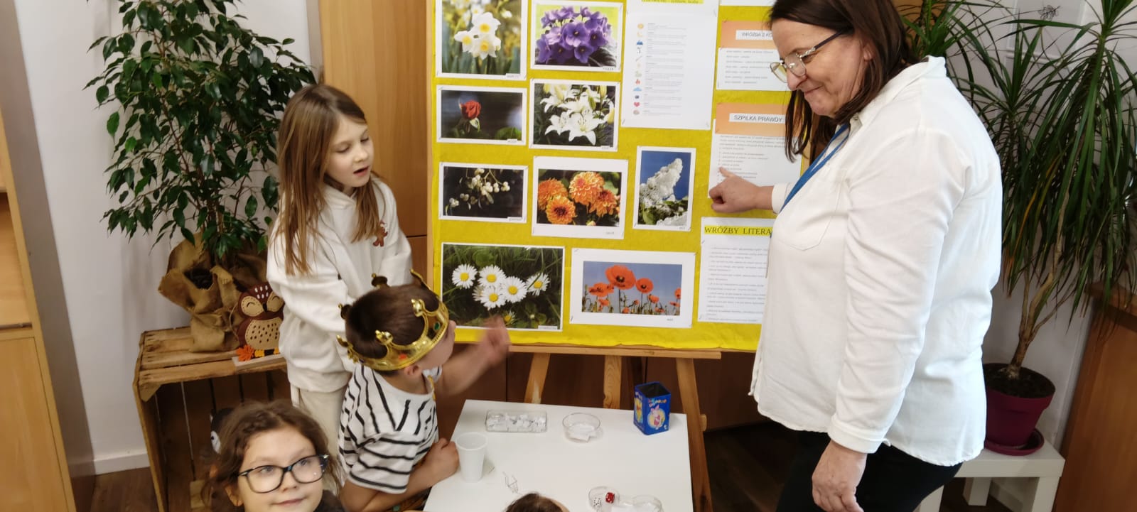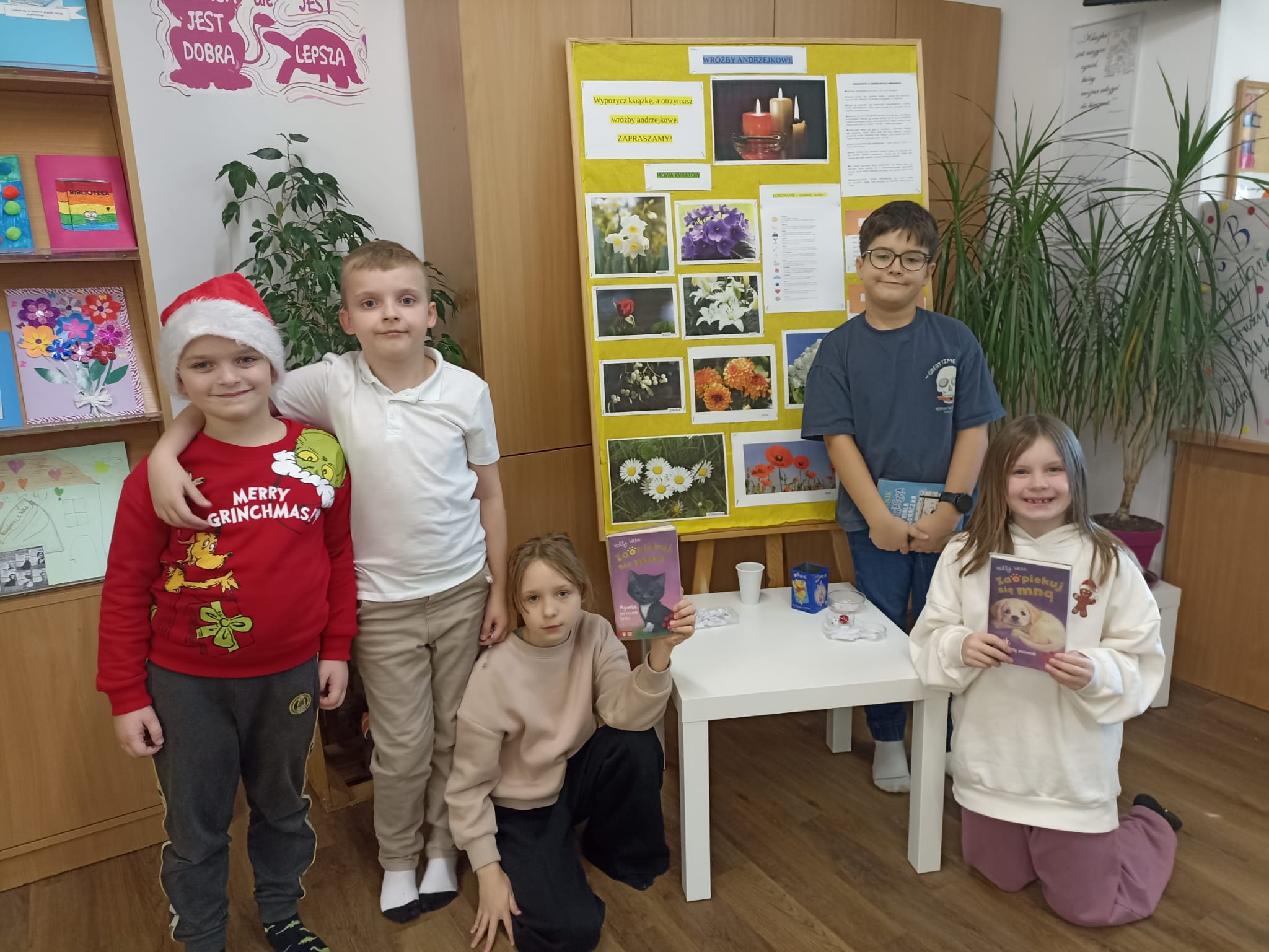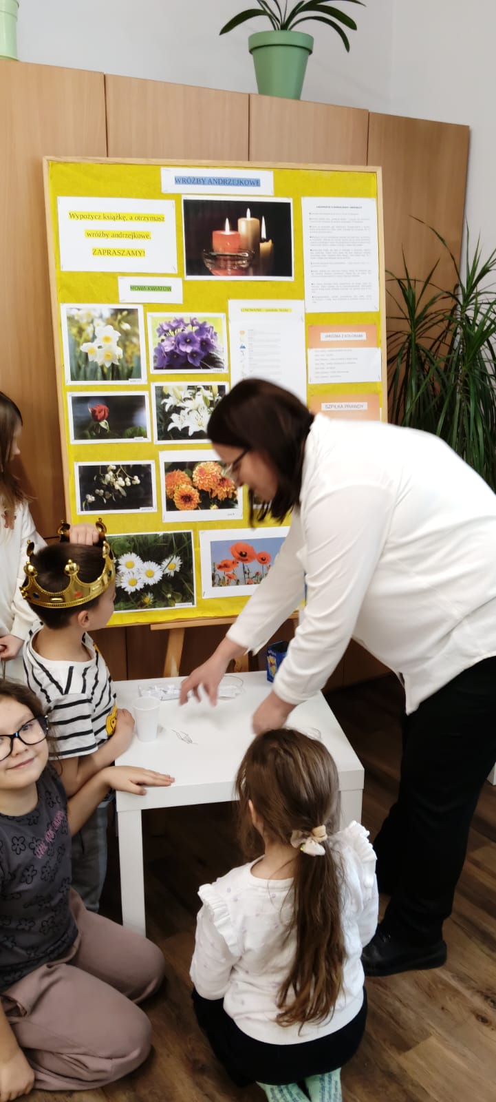 W piątek biblioteka szkolna na jeden dzień zamieniła się w niezwykłą krainę andrzejkowych czarów. Uczniowie odwiedzający bibliotekę oraz dzieci ze świetlicy z radością odkrywały tajemnice przyszłości poprzez m.in. mowę kwiatów, znaczenie kolorów, losowanie symboli, numerologię oraz „szpilki prawdy”, które wzbudzały wiele emocji.