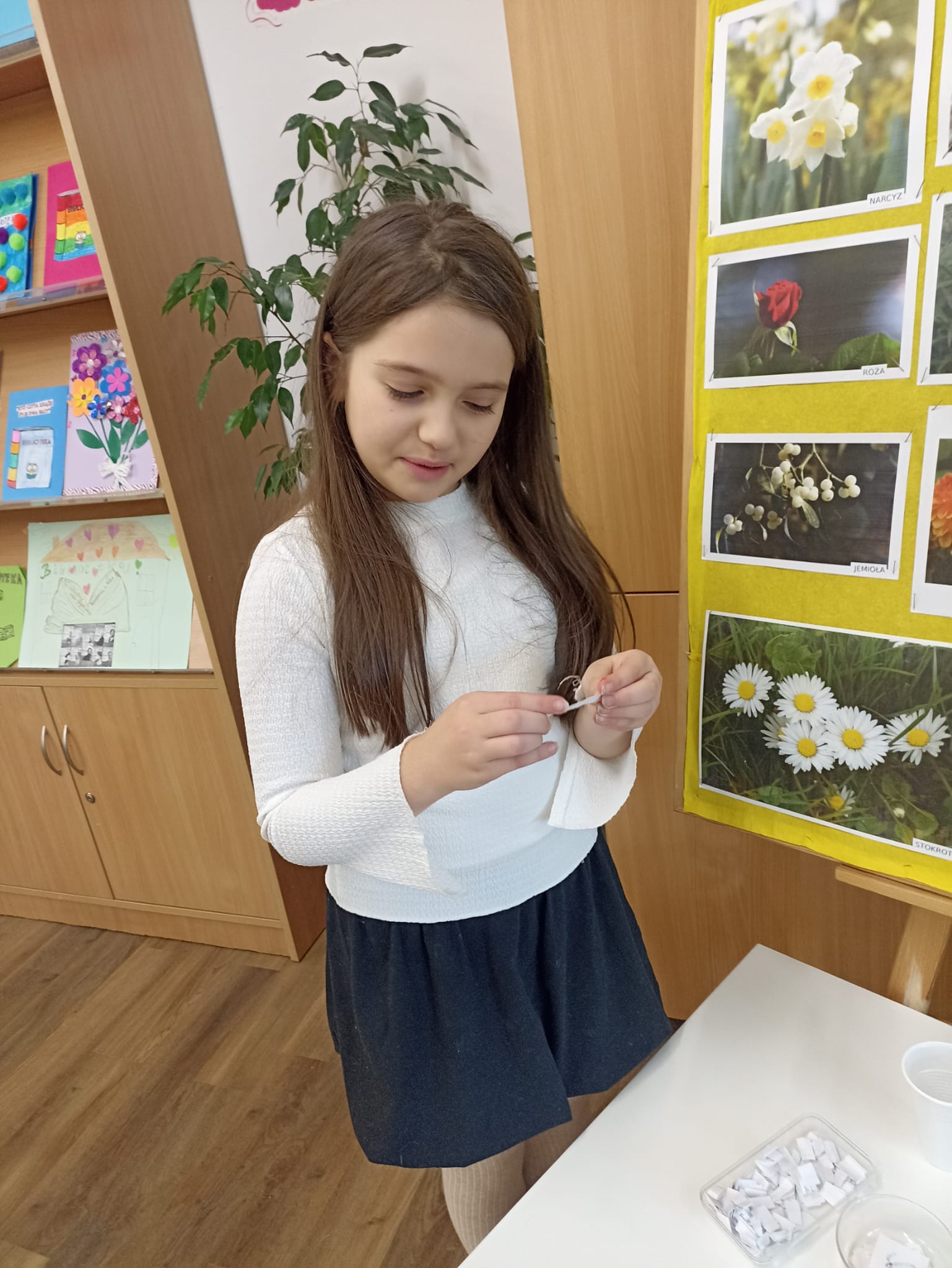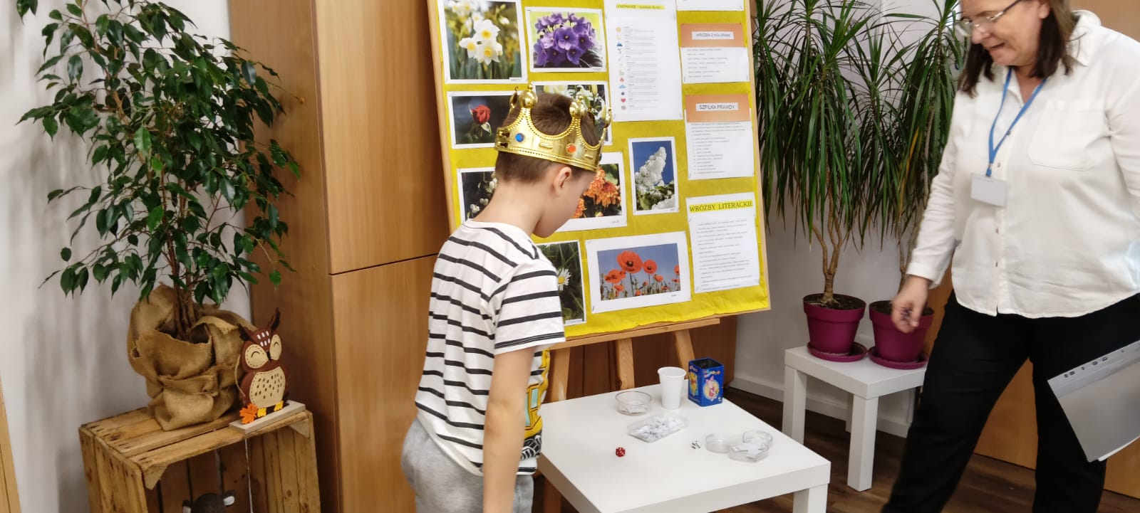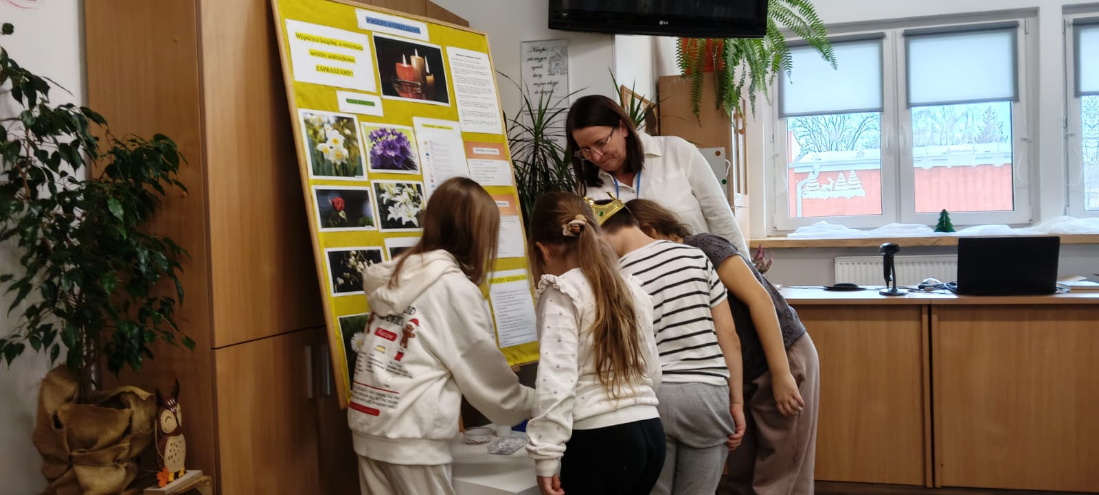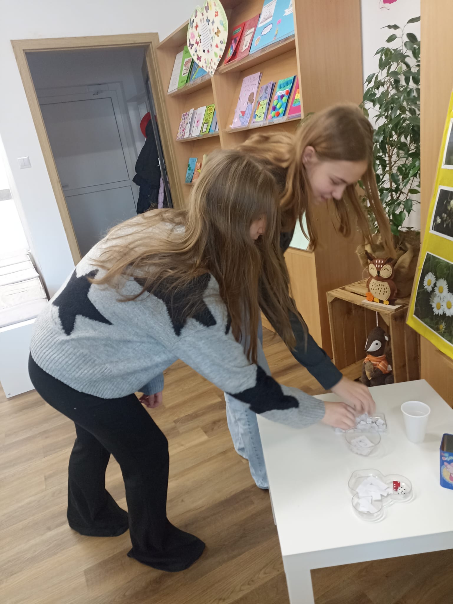 W piątek biblioteka szkolna na jeden dzień zamieniła się w niezwykłą krainę andrzejkowych czarów. Uczniowie odwiedzający bibliotekę oraz dzieci ze świetlicy z radością odkrywały tajemnice przyszłości poprzez m.in. mowę kwiatów, znaczenie kolorów, losowanie symboli, numerologię oraz „szpilki prawdy”, które wzbudzały wiele emocji.