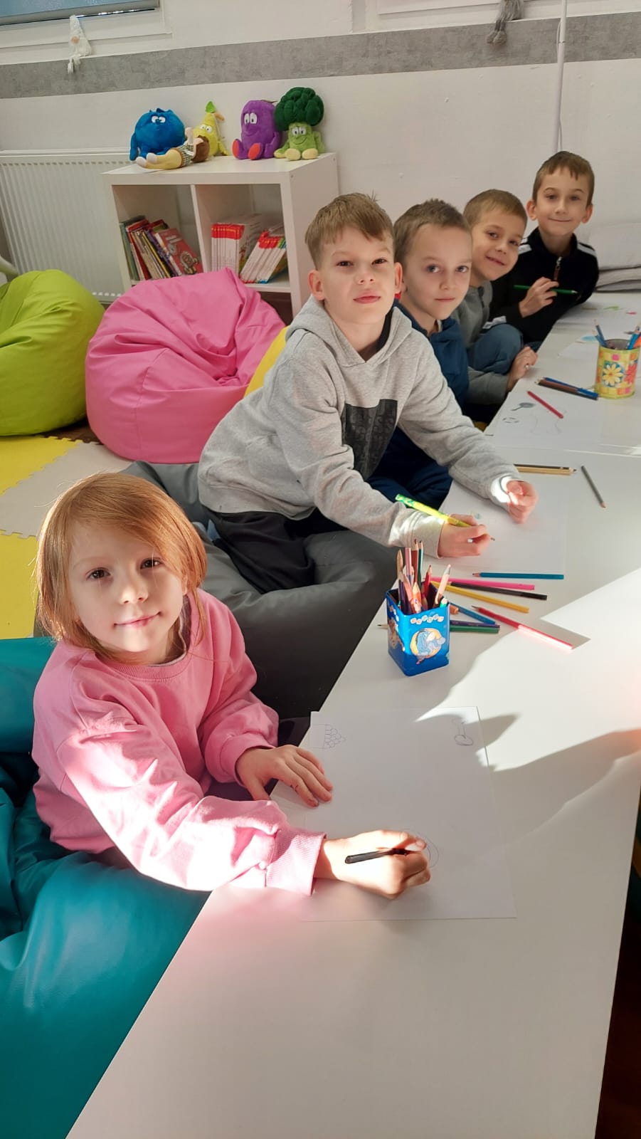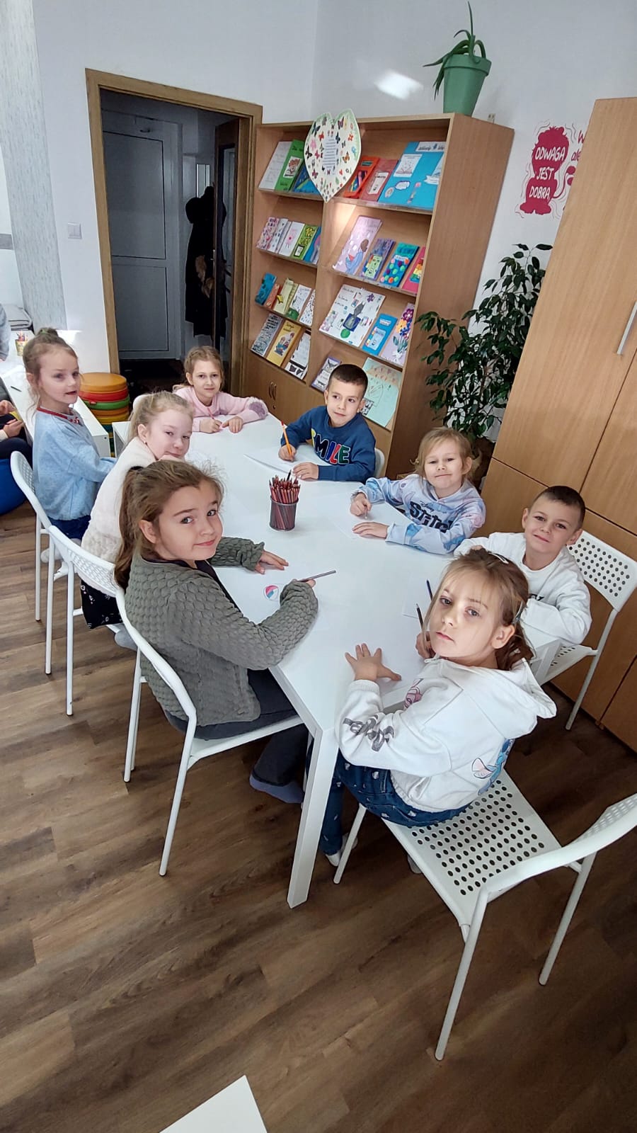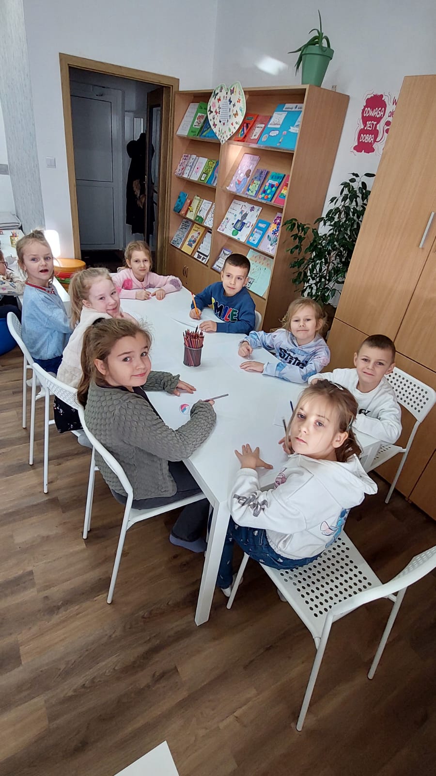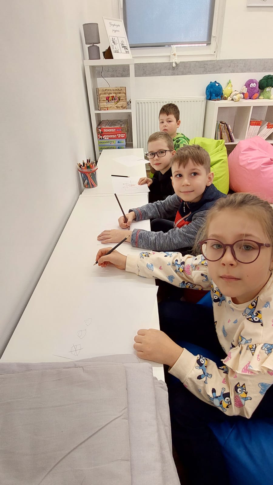 Dzieci chętnie wypowiadały się na temat dobroci i niesienia radości innym, a także z uśmiechem naśladowały charakterystyczne odgłosy Matyldy. Na zakończenie zajęć każdy uczeń przygotował pracę plastyczną — prezent dla wybranego zwierzęcia — który trafił do magicznego pudełka pełnego dobrych życzeń.