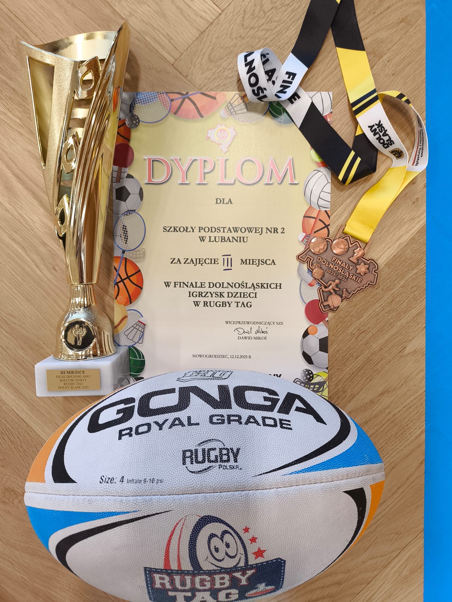 Drużyna w składzie: Wandycz Jakub, Sobota Kacper, Frankiewicz Oskar, Jaracz Antoni, Popławski Karol, Sikorska Zuzanna, Szczepańska Julia, Maras Wiktoria, Wesołowska Matylda. Po zaciętej rywalizacji zajęli zaszczytne III miejsce w Finale Dolnośląskich Igrzysk Dzieci w Rugby TAG 🏉