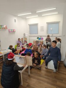 Dzieci z ogromnym zaciekawieniem śledziły losy małego jelonka, który dzięki odwadze i wielkiemu sercu pomógł Mikołajowi ruszyć w świąteczną podróż. Ilustracje wyświetlane w drewnianym parawanie kamishibai stworzyły niepowtarzalny klimat – magiczny, bliski, ciepły.