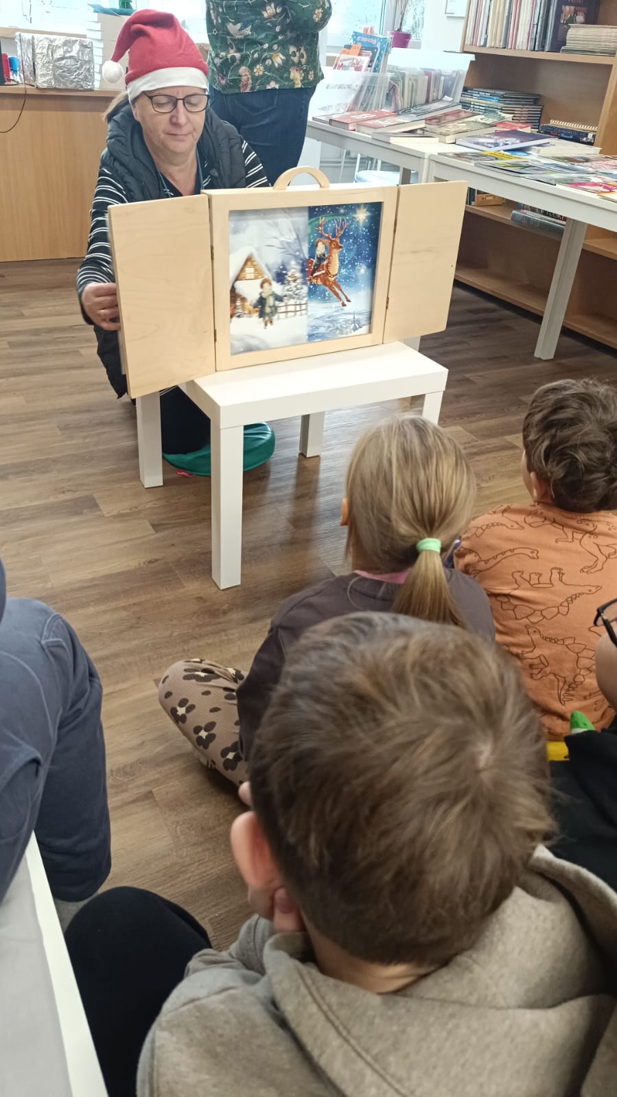 Dzieci z ogromnym zaciekawieniem śledziły losy małego jelonka, który dzięki odwadze i wielkiemu sercu pomógł Mikołajowi ruszyć w świąteczną podróż. Ilustracje wyświetlane w drewnianym parawanie kamishibai stworzyły niepowtarzalny klimat – magiczny, bliski, ciepły.