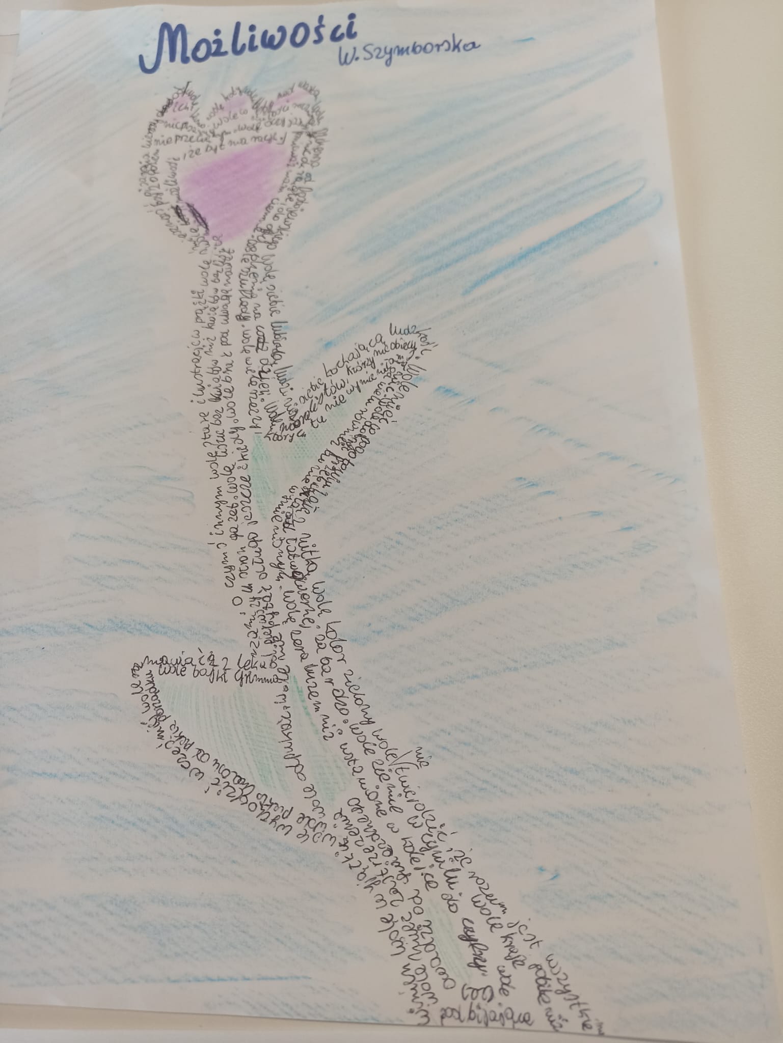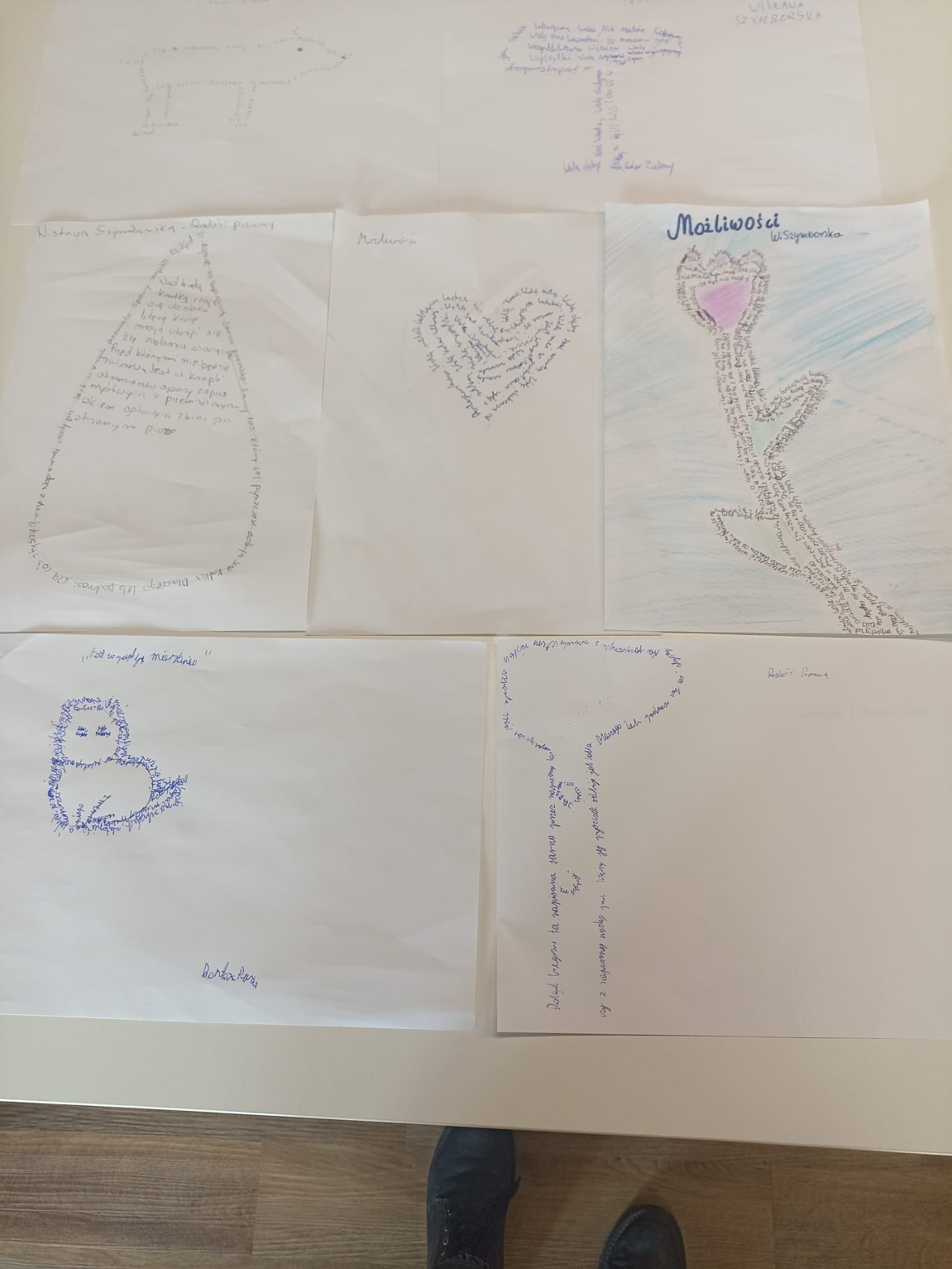 🔹 Klasa 7b pracowała z poezją Wisławy Szymborskiej, tworząc kaligramy – niezwykłe połączenia słowa i obrazu.