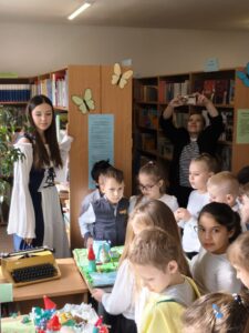 Podczas zajęć dzieci wyruszyły w symboliczną podróż po bibliotece, poznając jej przestrzeń, zasady i możliwości. Opowieść inspirowana teatrzykiem kamishibai „Wypożyczalnia skrzydeł” wprowadziła je w świat książek i pokazała, że mogą one stać się skrzydłami – przenosić w różne miejsca, rozbudzać wyobraźnię i pomagać lepiej rozumieć siebie oraz innych. Pierwszoklasiści aktywnie uczestniczyli w spotkaniu – odpowiadali na pytania, rozpoznawali właściwe i niewłaściwe zachowania wobec książek, a także dowiedzieli się, jakie zasady obowiązują w bibliotece. Rozmawialiśmy również o tym, że jest to miejsce, w którym można nie tylko czytać, ale też na chwilę się zatrzymać, wyciszyć i pobyć razem.